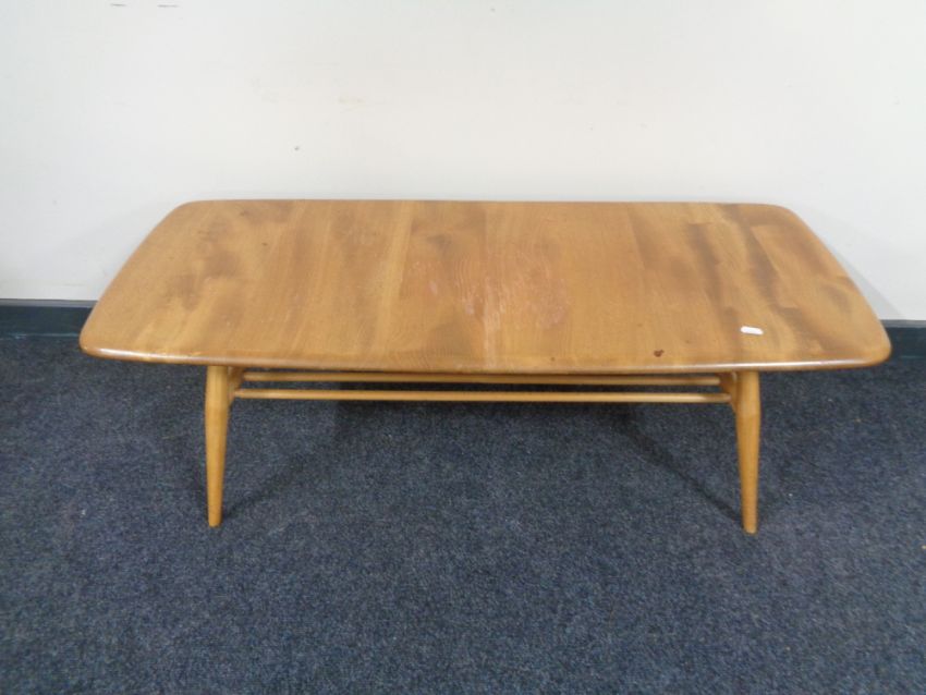An Ercol solid elm and beech occasional coffee table with undershelf, catalogue no. 459