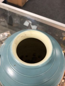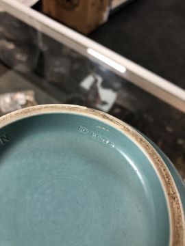 Crazing around inner rim. What appears to be a firing crack on the edge of the base, near the impressed Wedgwood mark. Otherwise good condition.