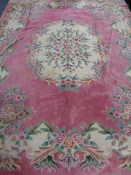 A large pink floral fringed Chinese carpet, 280 cm x 380 cm