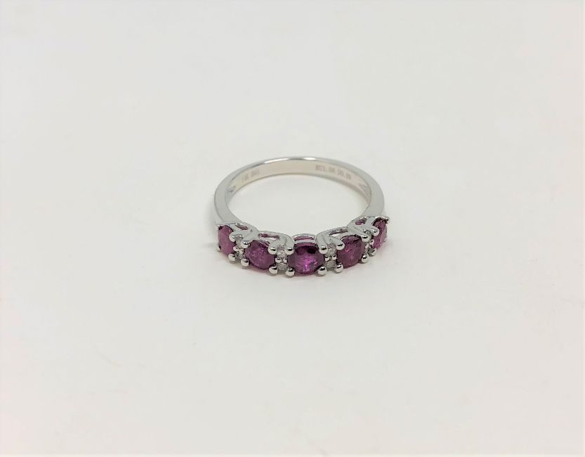 A 14ct white gold ruby and diamond ring, featuring five round cut rubies (1.06ct), claw set with eight round brilliant cut diamonds, size M. With certification.