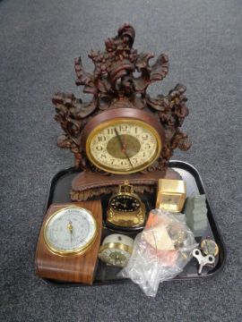 A tray of mid century barometer, assorted mantel and desk clocks, keys and winders