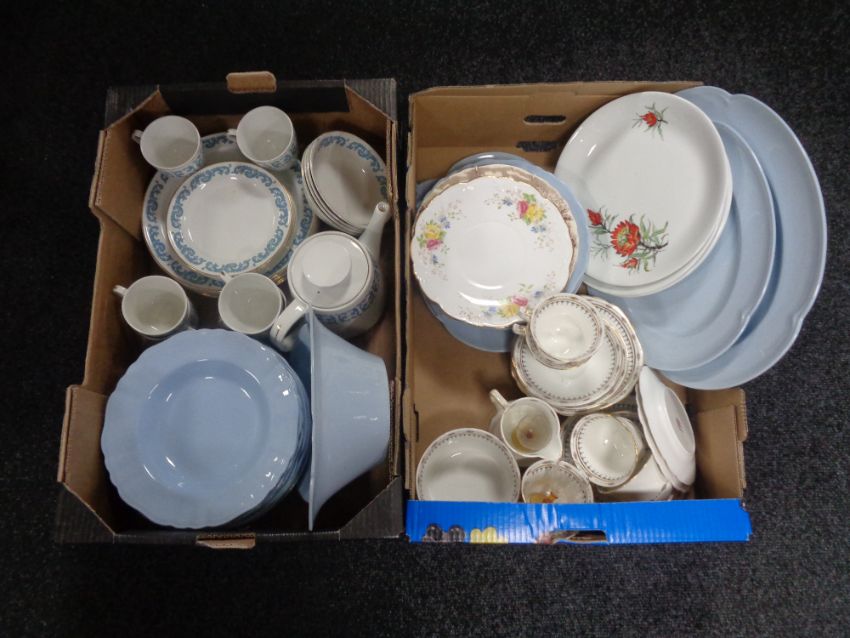 Two boxes containing County Sussex ironstone tea and dinner ware, J & G Meakin dinner ware, tea china etc