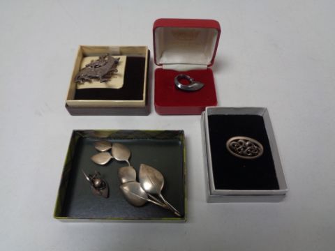A pair of silver leaf earrings, silver leaf brooch and three further silver brooches