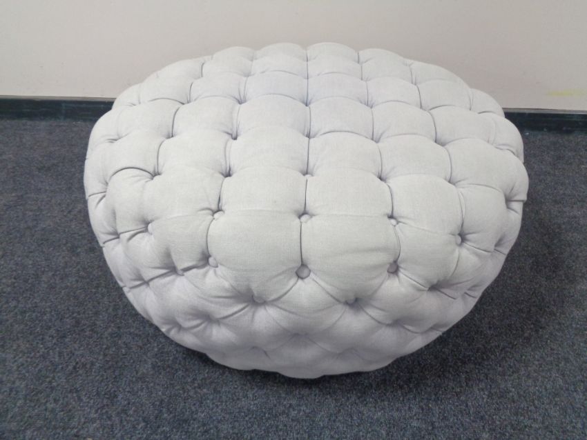A circular oversized footstool in button fabric