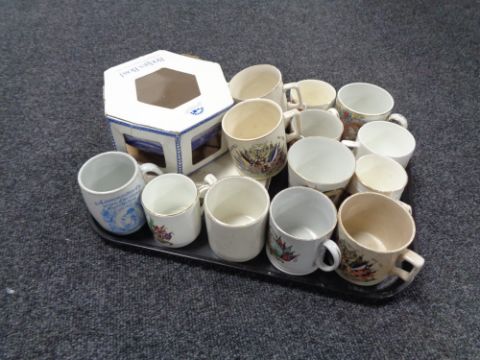 A tray of china, commemorative beakers, 19th century commemorative ware etc