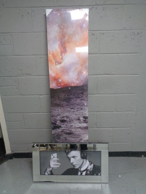 A contemporary three fold screen depicting the moon surface together with a mirror-framed David Bowie picture (a/f)