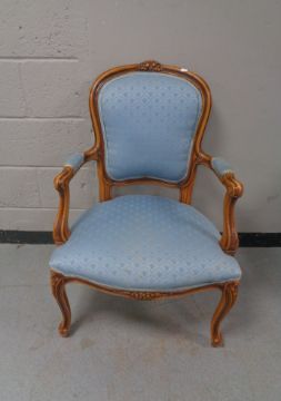 A carved beech framed salon armchair in blue fabric