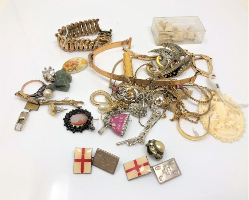 Assorted silver and gilt jewellery including enamelled cufflinks, bone, jade etc