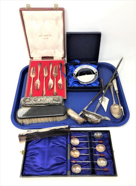 A collection of silver and plated items including silver backed dressing table items, two silver toddy ladles, cased set of EPNS fish forks, set of six EPNS coffee spoons etc