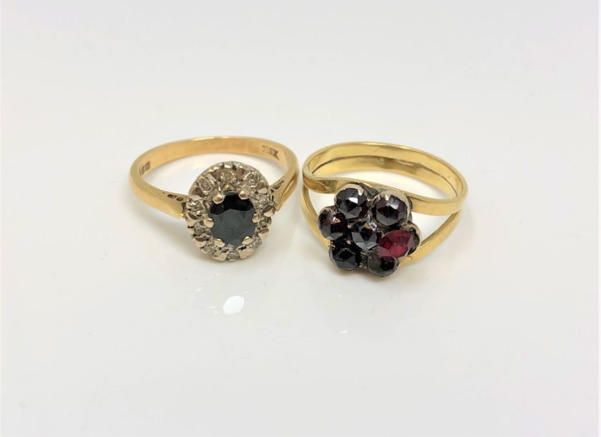 An 18ct gold sapphire and diamond ring and a gold garnet ring (2)