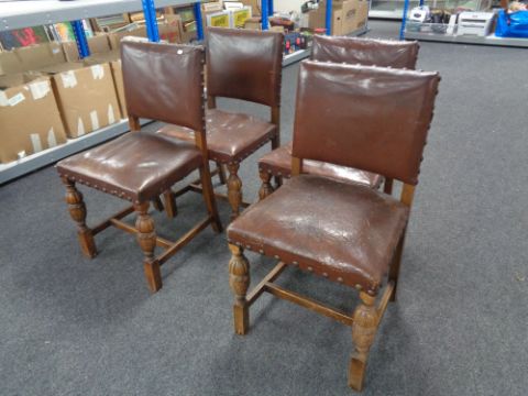 A set of four carved Edwardian oak dining chairs, upholstered in a button leather