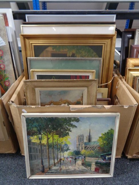 A box of continental school pictures and prints, oil on canvas Parisian street scene, framed tapestries etc