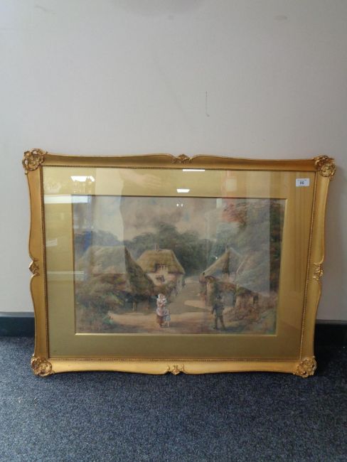 Beatrix Pollitt (1863-1935), figures in a rural village, watercolour, 59cm by 40cm.