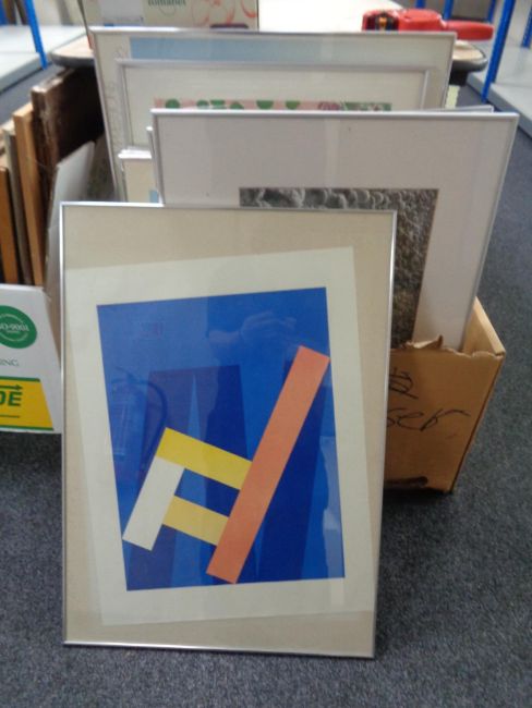 A box of twelve contemporary framed pictures and prints, gallery poster etc