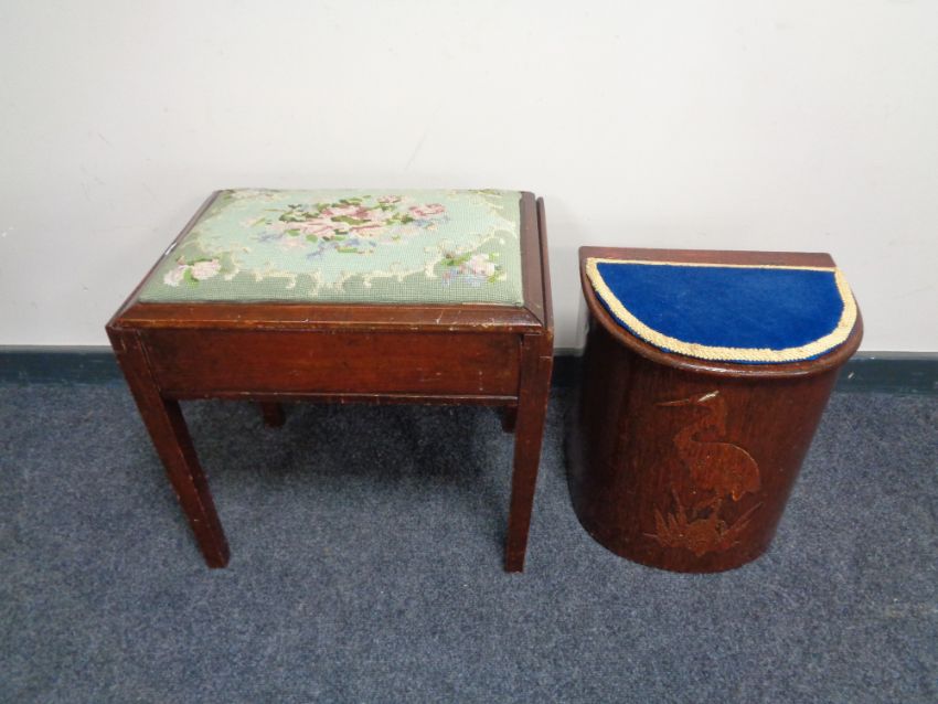 An Edwardian mahogany tapestry upholstered storage piano stool, with a further storage stool