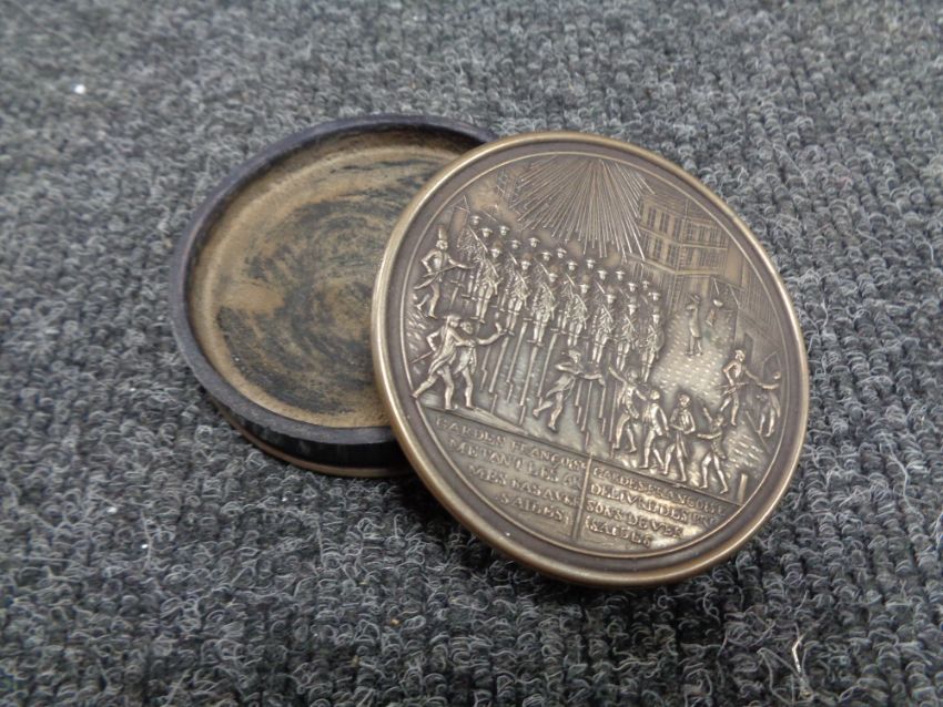 A continental white metal mounted snuff box, the lid depicting figures in a town square, diameter 76mm.