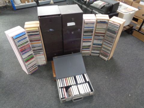 Five wooden racks, two cases and two storage drawers containing a large quantity of assorted CDs and cassette tapes