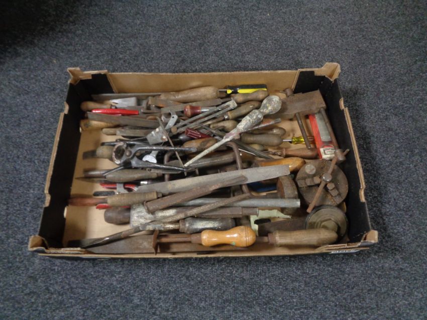 A box of vintage hand tools, brace, files, spanners etc
