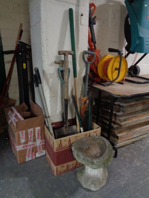 A box of assorted garden tools and a hand saw together with a stone bird bath