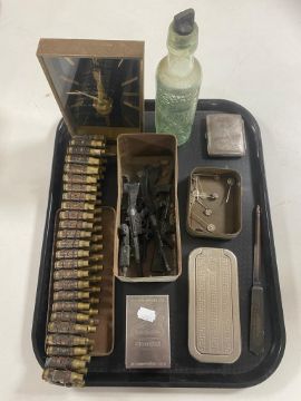 A tray containing 007 tin with die cast guns, cigarette case, bandolier of bullets, vintage glass bottle, German pin badges, etc.