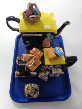 A tray containing two Ringtons novelty teapots, the Tea Merchant teapot No. 44 of 17,500 and the Ringtons Van teapot No. 959 of 17,500, with sugar basin