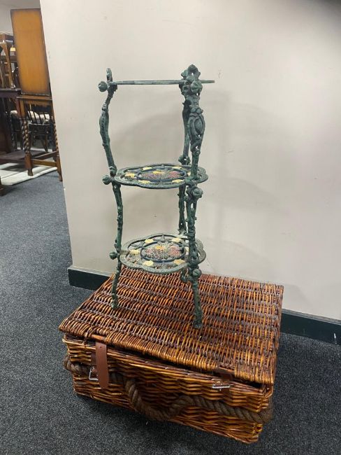 Two graduated wicker baskets together with a metal three tier pan stand (a/f)