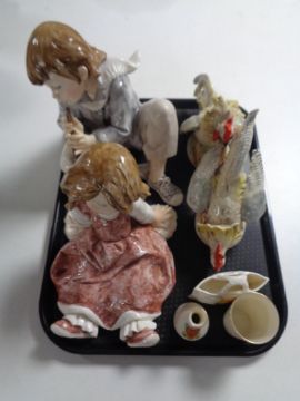 A tray containing three pieces of Goss tourist china, a pair of pottery cockerels, together with two mid 20th century figures of seated children