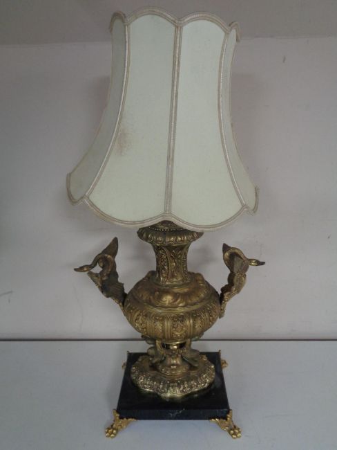 An early twentieth century ornate brass table lamp depicting swans in flight above cherubs on black marble base with shade