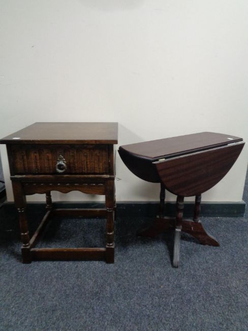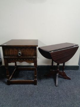 An oak single drawer side table on raised legs, with a flap sided occasional table