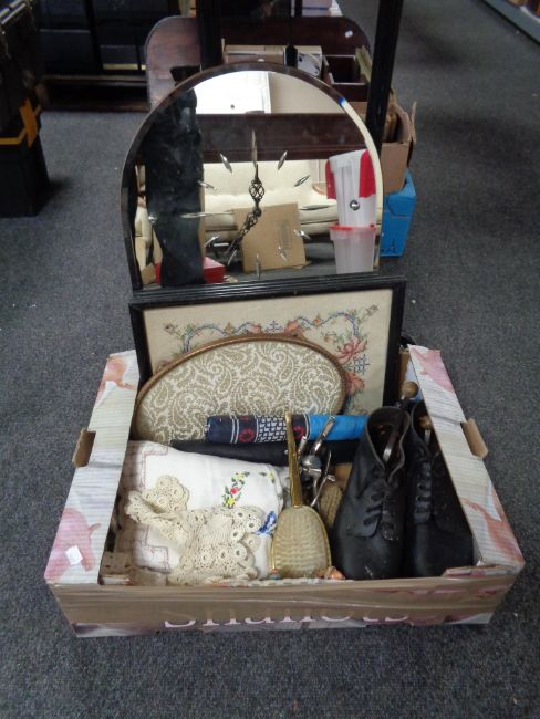 A box containing a pair of vintage leather boots with stretchers, table linen, dressing table brush set, frameless archtop mirror fitted with a clock, Goebel figures etc
