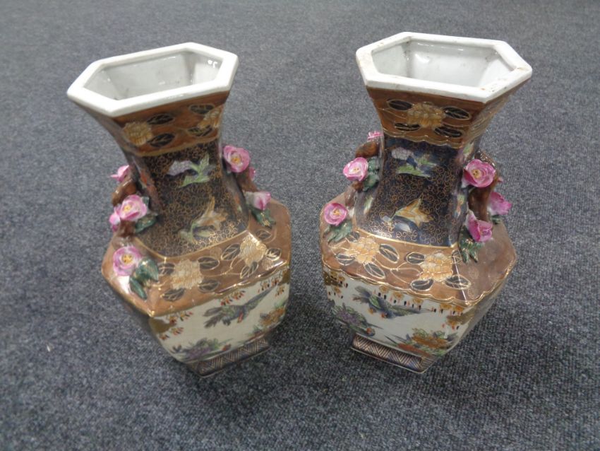 A pair of 20th century Japanese pottery vases depicting birds, with further rose decoration
