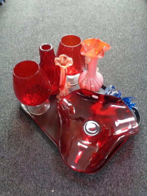 A tray containing 20th century glassware to include Venetian glass vases, envelope bowl, bark vase etc