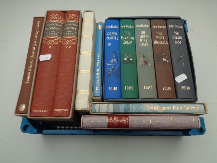 A basket containing Solio Society volumes to include two volumes of Thayer's Life of Beethoven, five volumes of John Buchanan together with five further volumes in protective slip covers