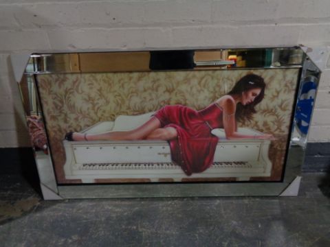 A contemporary framed print of a lady in red dress reclining on a grand piano, with glitter decoration, in mirrored frame