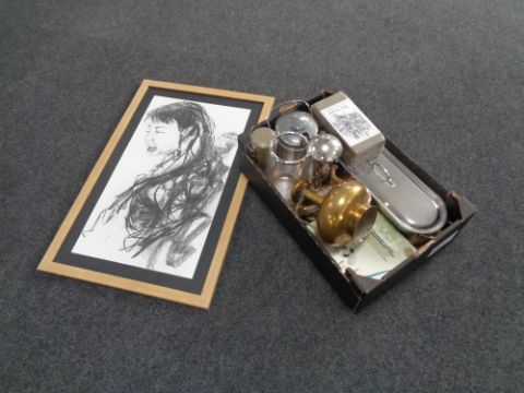 A framed charcoal drawing, girl screaming, together with a box containing miscellaneous to include brass teapot, stainless steel fish kettle, ice bucket etc