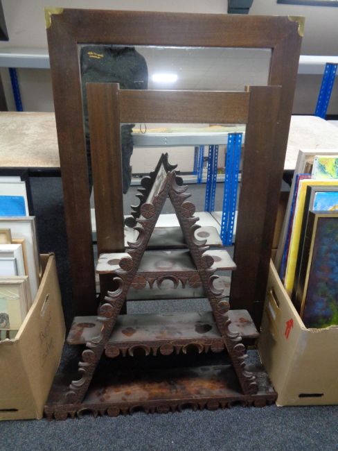 Two framed wall mirrors, one with brass mounts, together with a carved pine triangular wall shelf