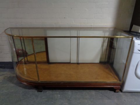 An Edwardian brass framed shaped shop display cabinet (glass a/f), no shelves