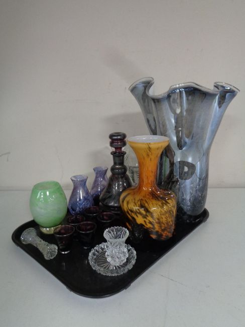 A tray containing assorted glassware to include an antique liqueur decanter with glasses, vases, contemporary envelope vase etc.