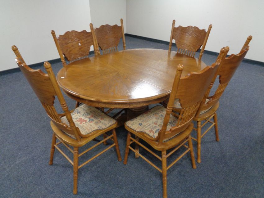 An American style circular extending dining table with leaf together with a set of six high backed chairs.