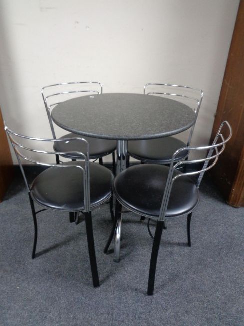 A marble topped bistro table on four way pedestal together with a set of four leather and metal dining chairs.