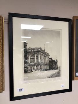 A framed monochrome etching, Lloyd's Bank District Office Newcastle upon Tyne, signed Harding.