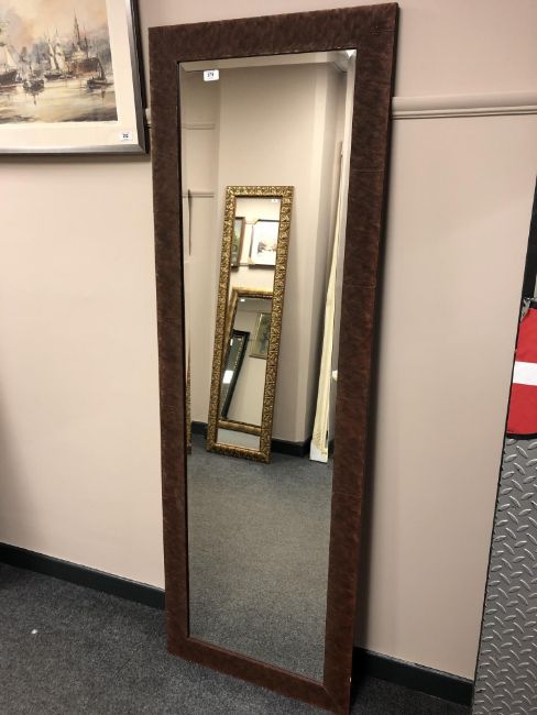 A copper-effect framed hall mirror