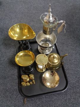 A tray containing a glass and metal wine carafe on stand, vintage kitchen scales with set of weights, brass ware to include egg timer.