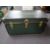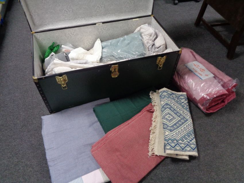 A metal bound shipping trunk containing curtains, bedding, etc (green).