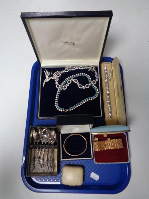 A tray of costume jewellery, necklaces, brooch, bracelets, 9ct gold plated bracelet and a box of six plated tea spoons