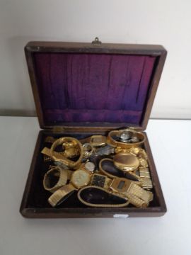 A box containing a collection of assorted ladies and gents gold plated wristwatches.