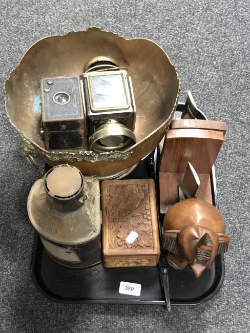 A tray containing carved wooden elephant, wooden trinket box and bookends, a starboard ship's lamp, a copper plated lion mask, twin handled punch bowl, etc.