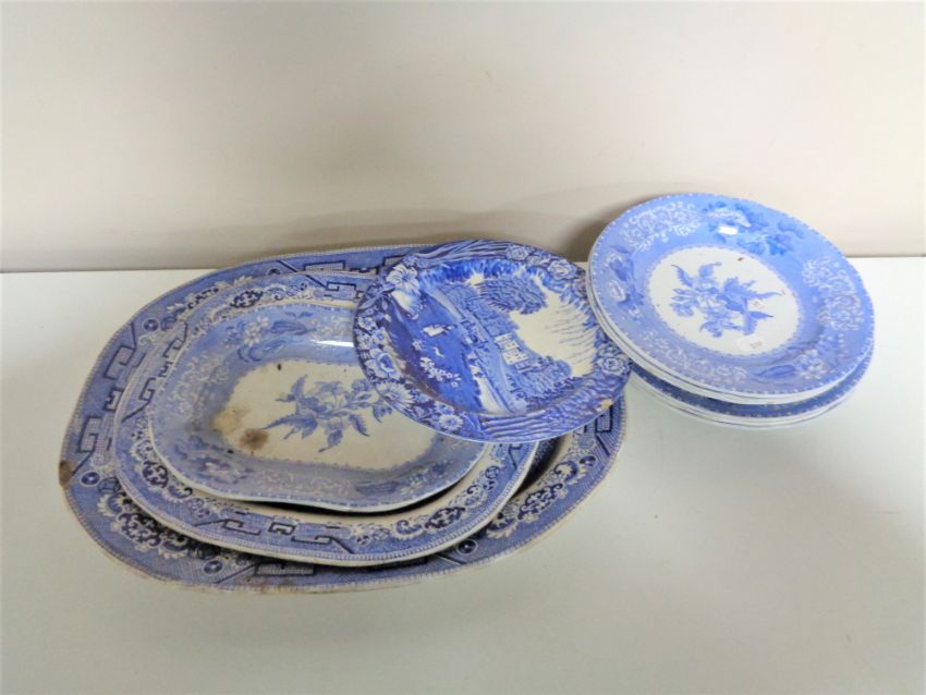 Twelve antique blue and white dinner plates and meat plates.