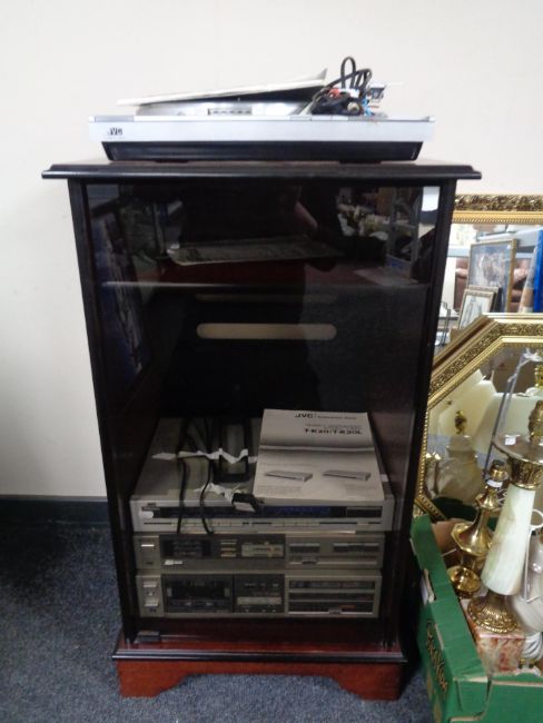 A mahogany audio cabinet containing Hi-Fi separates to include a JVC turntable and quartz synthesizer, Sony integrated stereo amplifier and stereo cassette deck.
