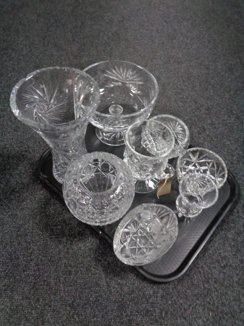 A tray containing assorted lead crystal glassware to include vases, twin handled goblet, basket, comport etc.